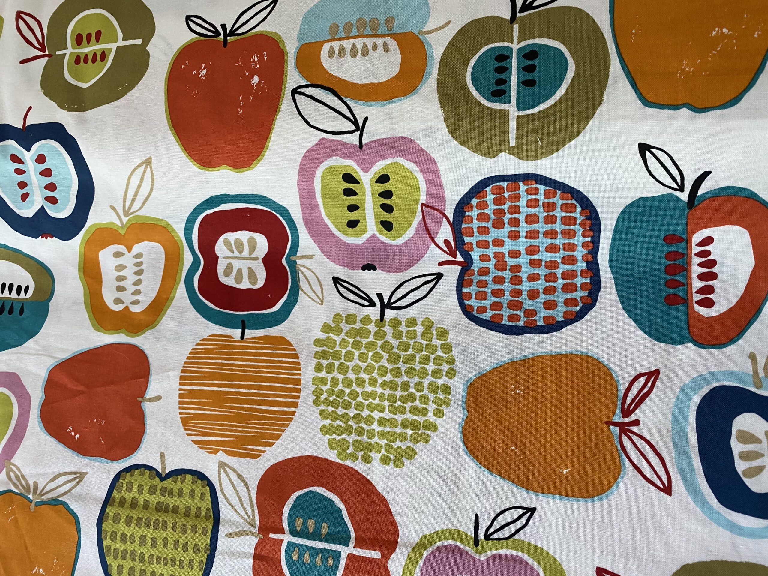 Pretty, bright coloured fabric from  Alexandra Henry detailing apples in shades of orange, green, teal and red