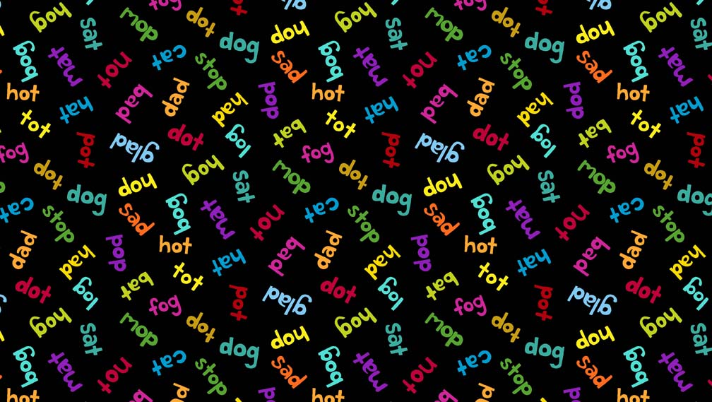 Brightly coloured words on a black background. Â This is a fun and colourful print – ideal for childrens quilts
