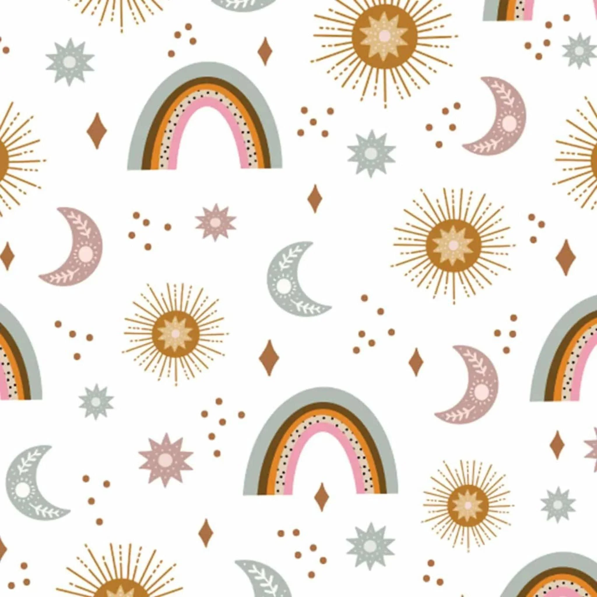 This pretty fabric comes from the Dashwood Night & Day range. Featuring scattered sun and rainbows in soft muted colours on a soft white background.