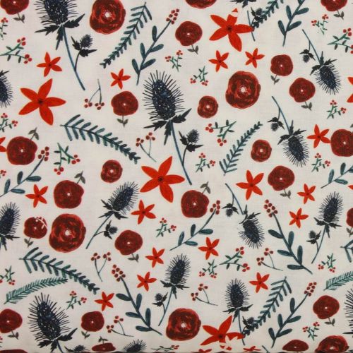 A pretty mix of oranges, spices   and winter foliage feature in in this pretty fabric all on a crisp white  background