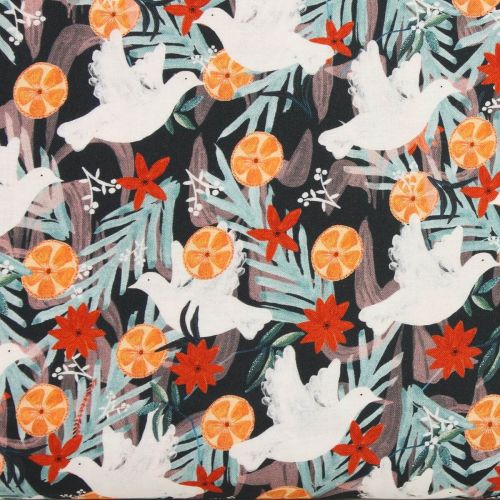 A pretty mix of white doves, oranges, star anise  and Winter foliage feature in in this pretty fabric all on a dark  background