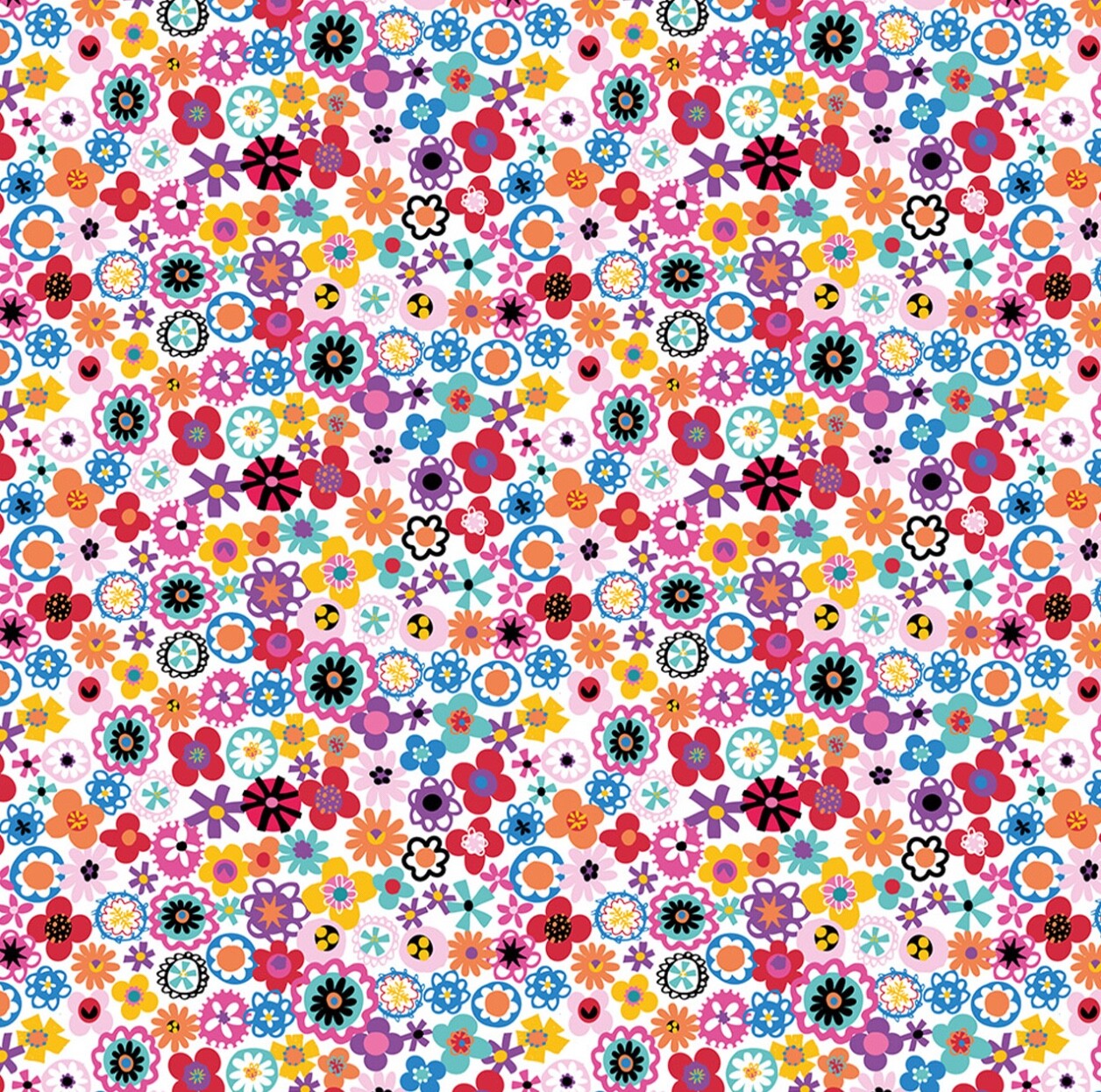 This pretty fabric from the Dashwood Studios Viva La Vida Collection features brightly coloured flowers on a white background.