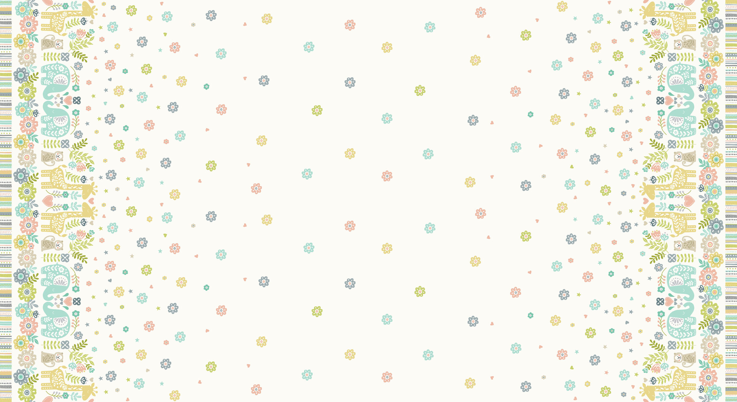 Makower Baby Safari Double Border. The border print features cute safari animals in soft shades on a soft white background. The design is printed along each edge of the fabric and is ideal for making childrens dresses, as well as bags and quilts