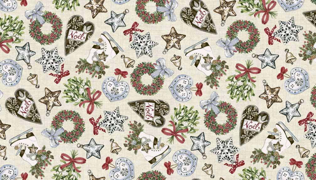 This range of Christmas prints from Makower have an old-fashioned look.  This one has holy wreaths, stars, ice-skates and bells in subtle colours on a deep cream background.