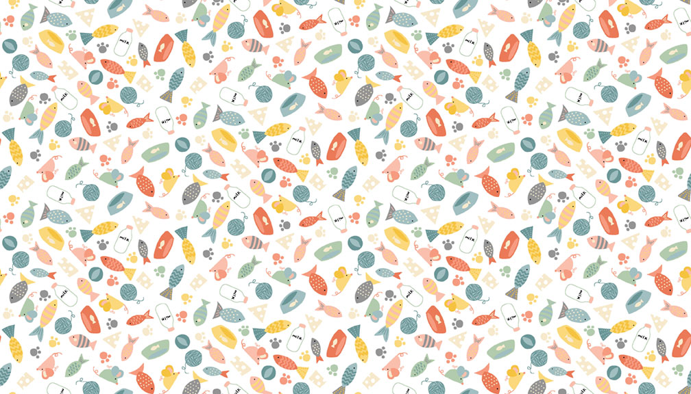 Small icons which relate to cats including bowl, milk bottle, fish, cheese and mice all on a soft white background. This fabric co-ordinates with others in the Cool Cats range.