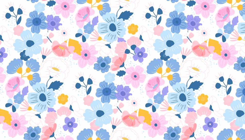 Makower Floral Splendor Range – This pretty fabric has pretty flowers in shades of lilac, blue and pink on a white background