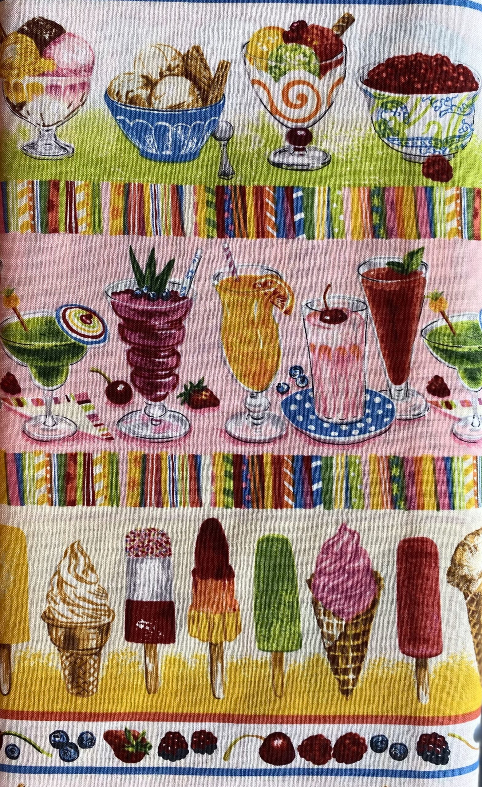 Makower Fruit & Ice Range – this fabric features brightly coloured ice cream sundaes, fruit , ice lollies and ice cream cones all in stripes. Â Ideal for borders