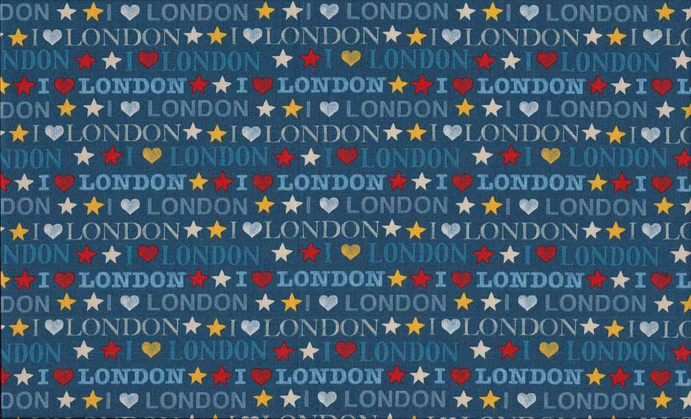 Makower I Love London Blue I Love London 985B – This fabric features the text “I LOVE LONDON” in colourful letters on a blue background.