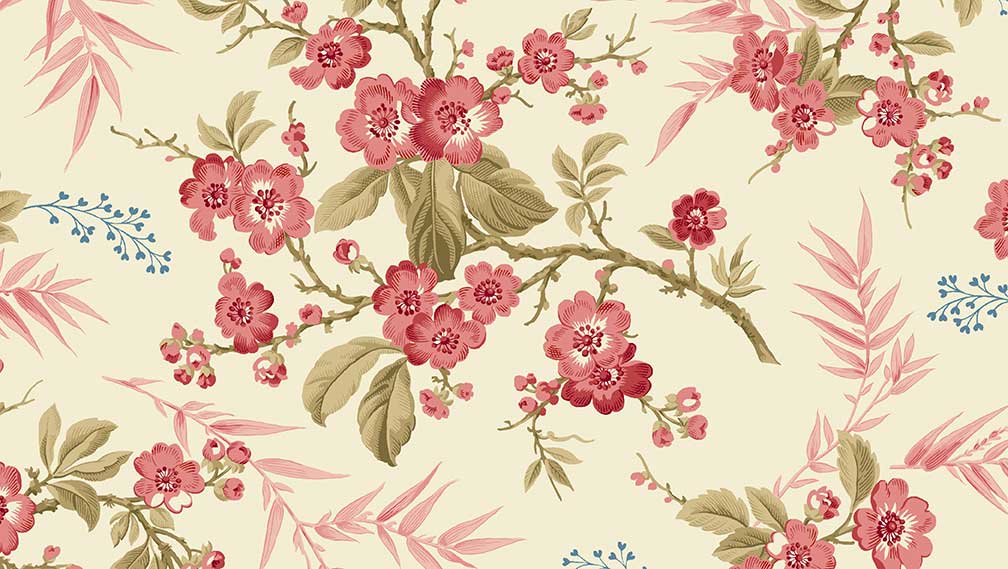 Beautiful large floral print in shades of green and pink  on a cream background.  Classic design great for all types of craft project