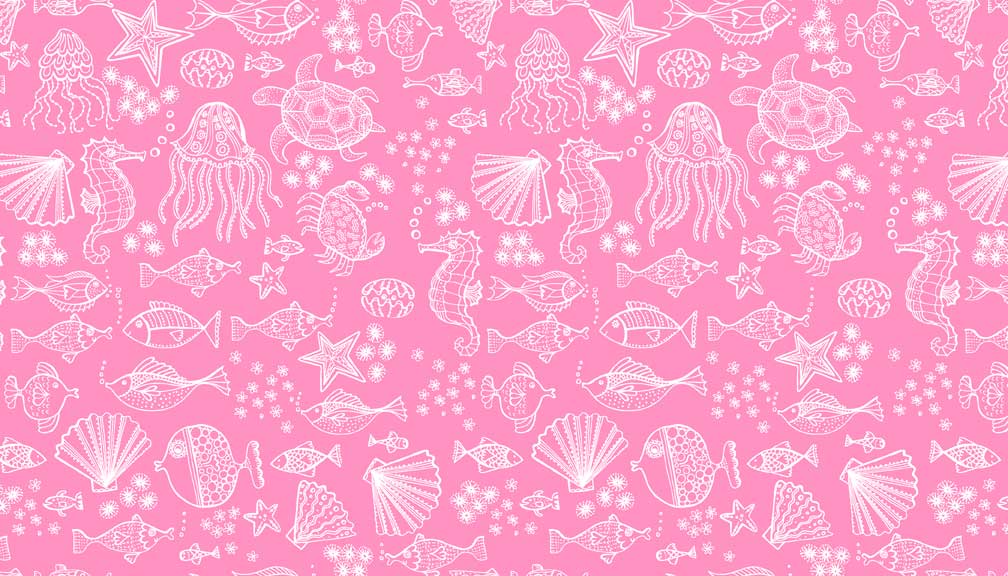 Makower Merryn Outline 2006P . White outlines of sea creatures and shells on a bright pink background