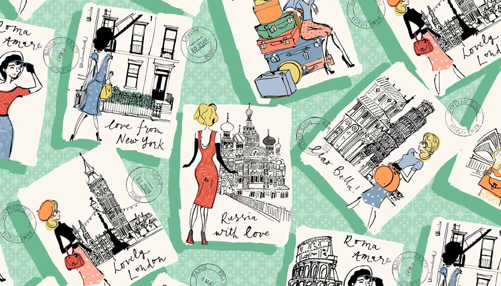 Retro fabric with fun postcards from around the world on a soft teal background. Fun fabric for all types of project