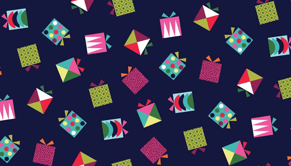 Makower Wrap It Up Range – this fabric features bright Christmas presents on a dark navy background. Great non-directional Christmas print in bright colours