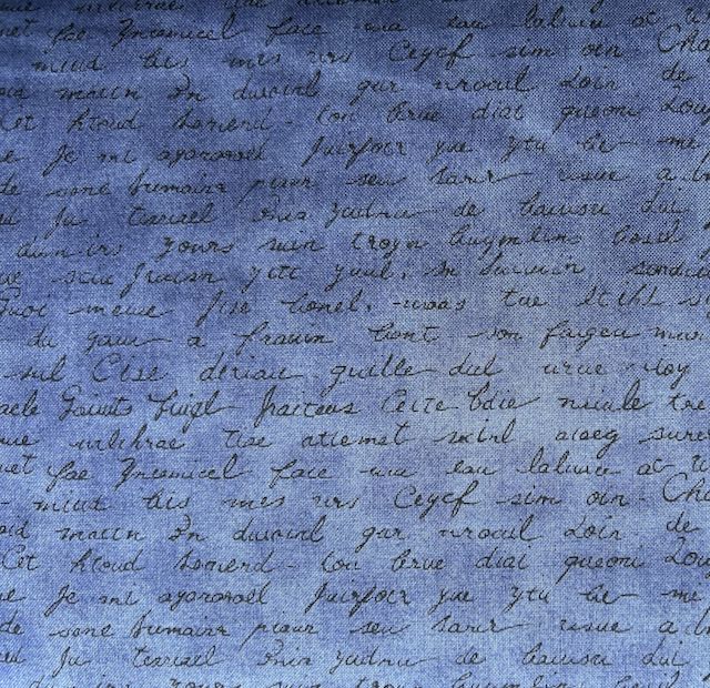 This useful fabric from Stop features small black script on a dark denim blue background